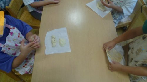 自分たちで作ったおやつをすぐに食べるのは 楽しみと美味しさが倍増(^_-)-☆ 「発酵いらずのパン作り」でおやつ作りをしました(^^♪
