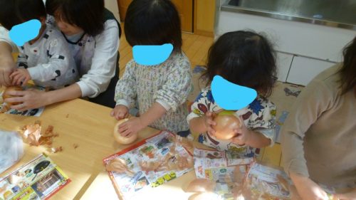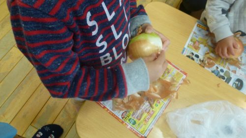 ●1・2歳児クラスの 『たまねぎの皮むき』