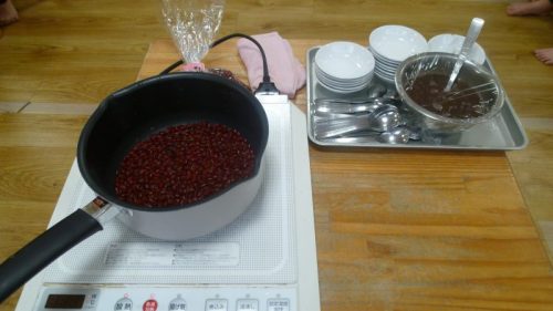 うたをうたい、あずきに触れたり、あずきの煮たのをみたり